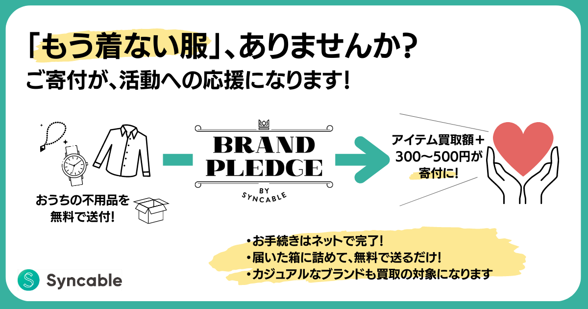 当法人アクセプト・インターナショナルが提携するBrand Pledgeは、ブランド買取のブランディアと寄付プラットフォームのSyncableが運営するファッションアイテムの買取寄付サービスです。 不要になった服やバッグを送料無料で送るだけで、査定額が支援団体への寄付になります。さらに、1件の申し込みにつき300〜500円が上乗せで寄付されるのも大きな特徴です。