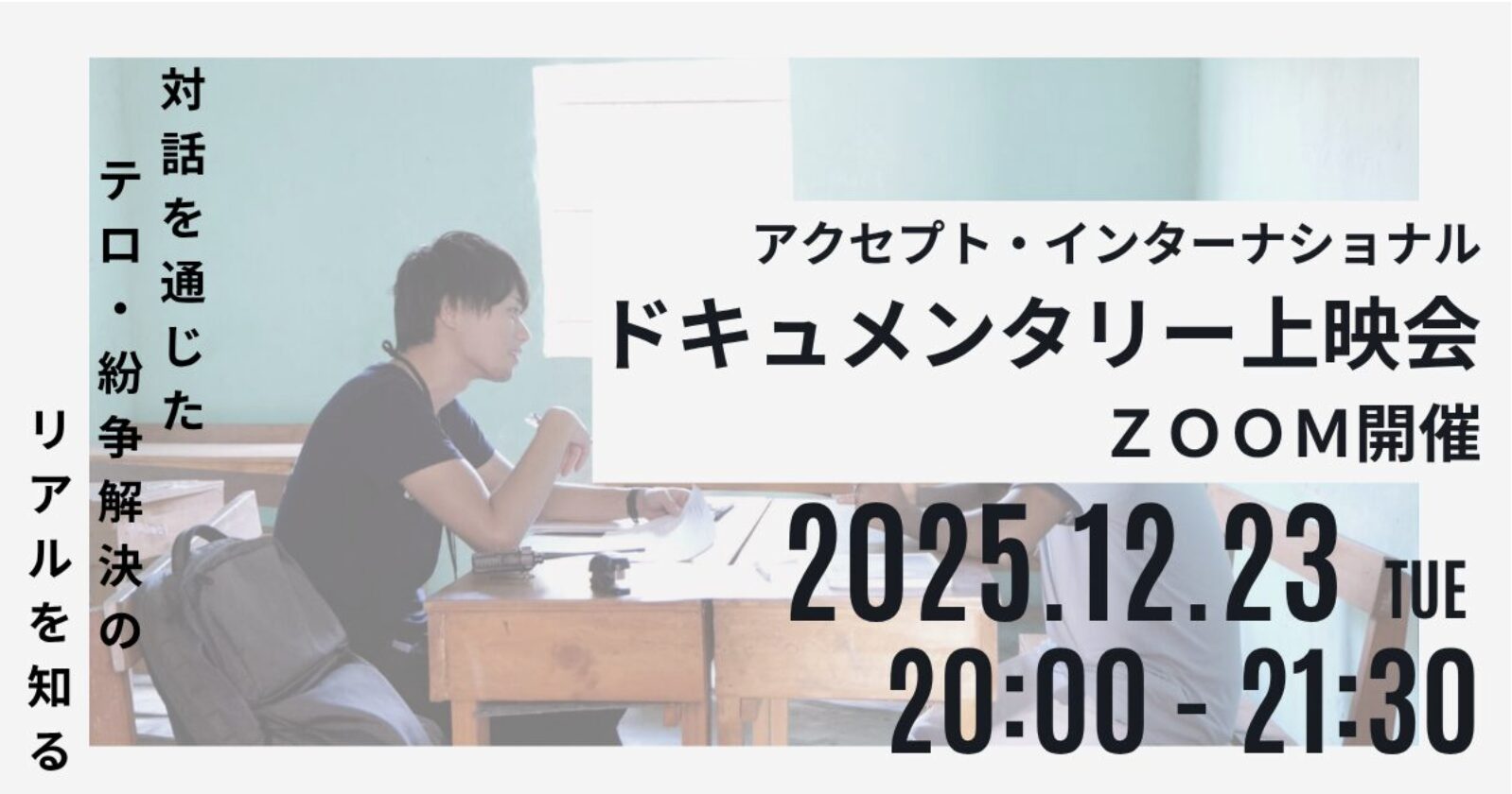 世界各地で起きているテロや紛争に関して普段からイメージを持つことは容易ではありませんが、ドキュメンタリー映像を通じて現場の問題を知り、皆様が平和について考えるきっかけとしていただけたら幸いです。