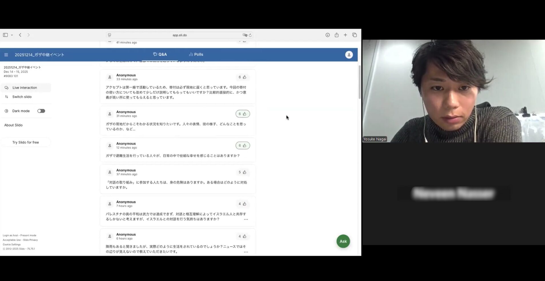 また、当日は170名近い方々にリアルタイムでご参加いただき、登壇者のネビーンにとっても日本の支援者の皆さまの存在を近くに感じることのできる機会となりました。今後も日本の皆さまにガザの現状、そしてガザの人々の声を直接お届けできる場を提供していく所存です。