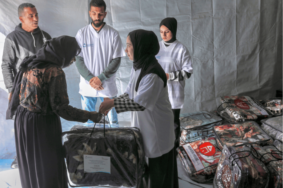 ▲ガザ北部避難民キャンプでの毛布配給の様子