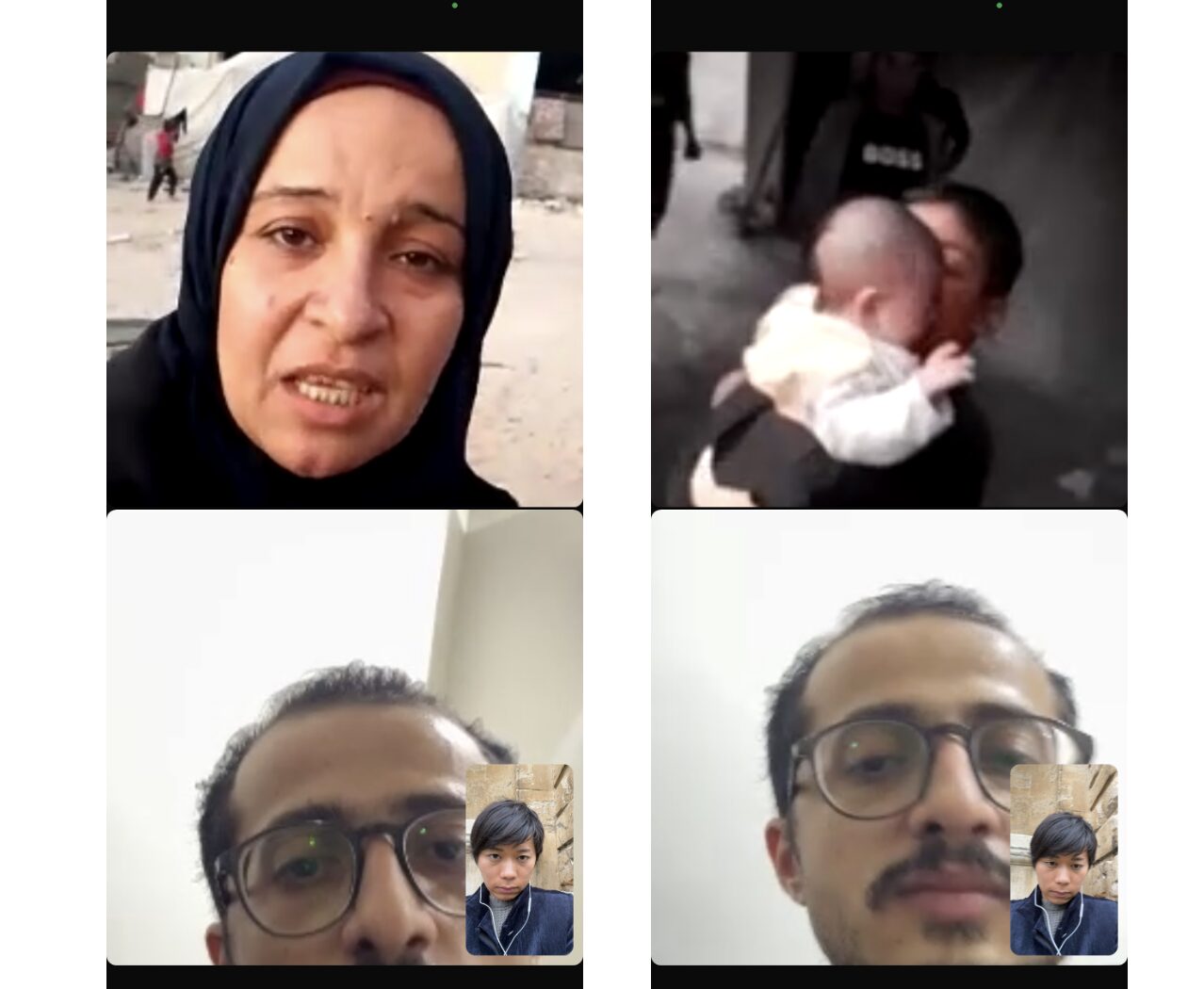 避難民キャンプの住民(画面上)とのビデオ通話の様子。画面下の男性は通訳として通話に参加しているイエメン事業現地代表のアムガッド。